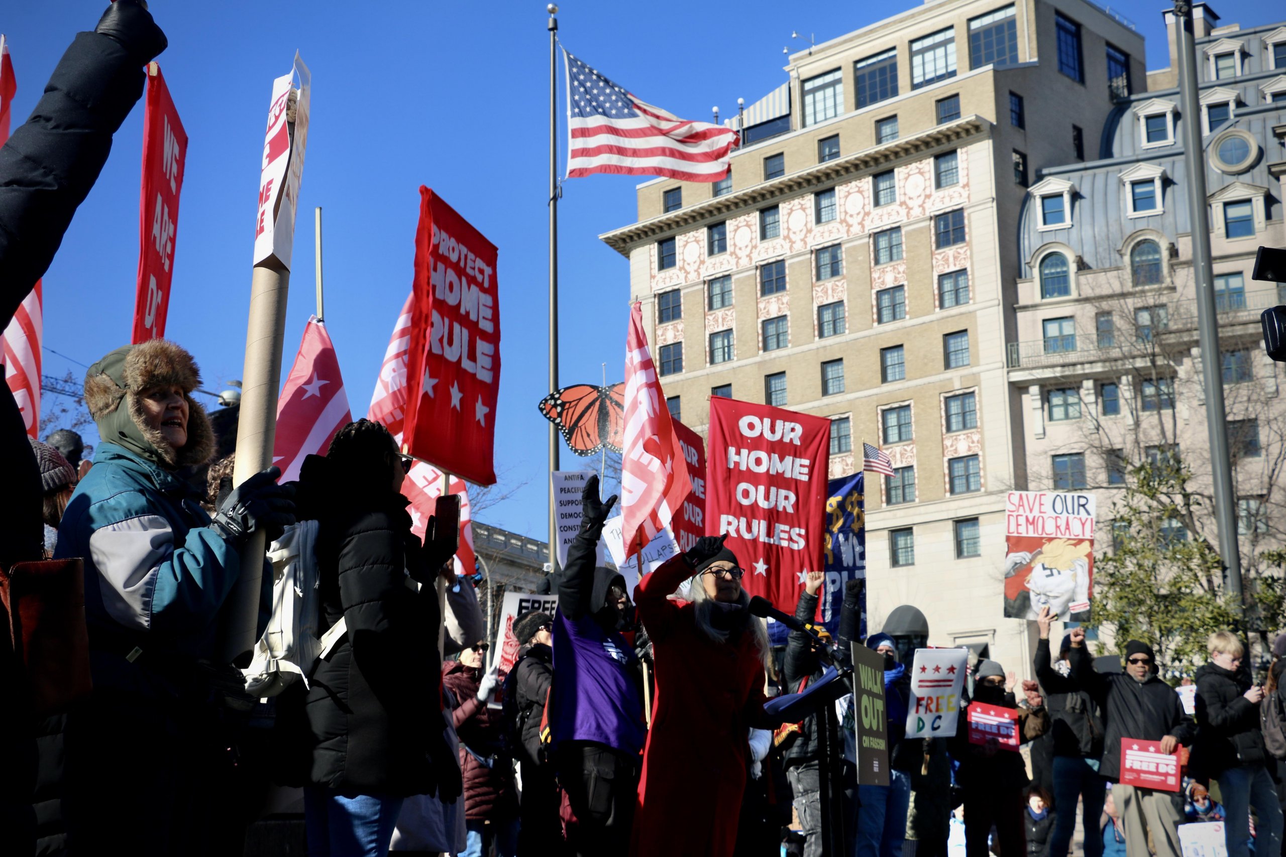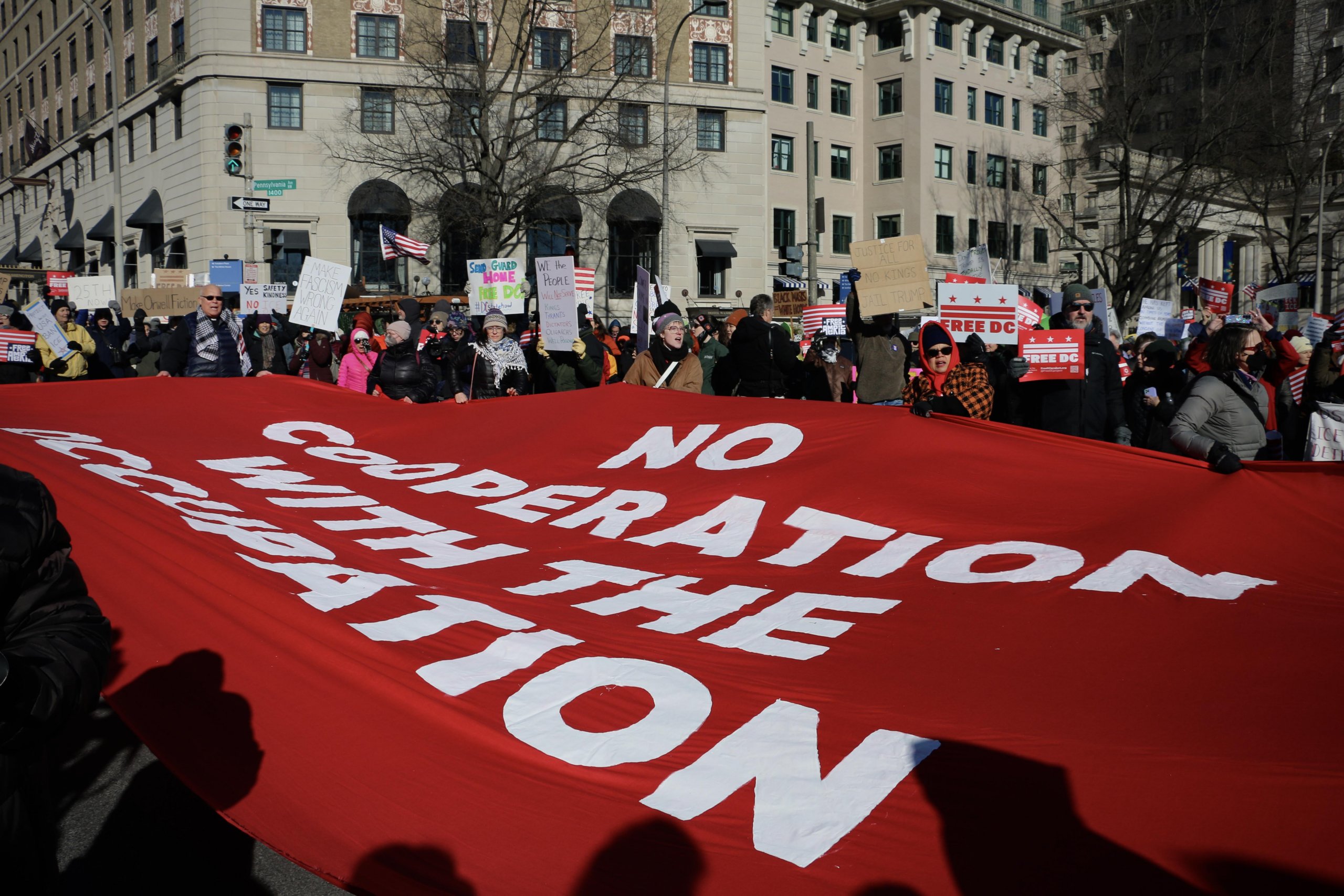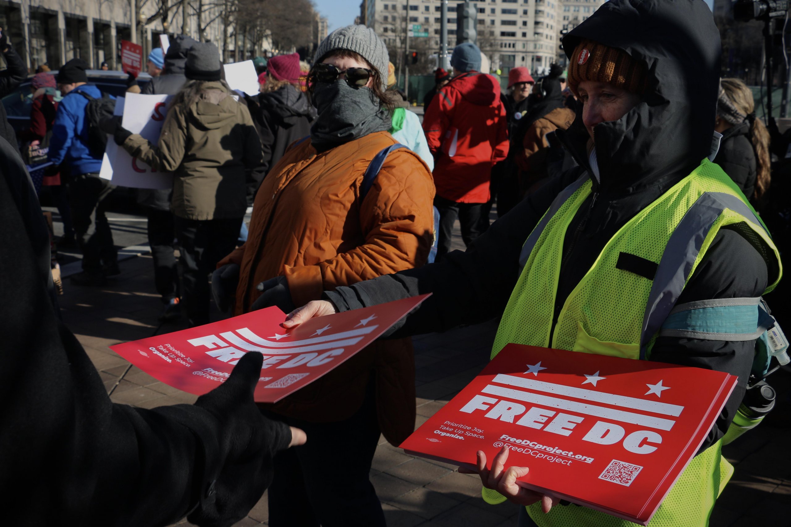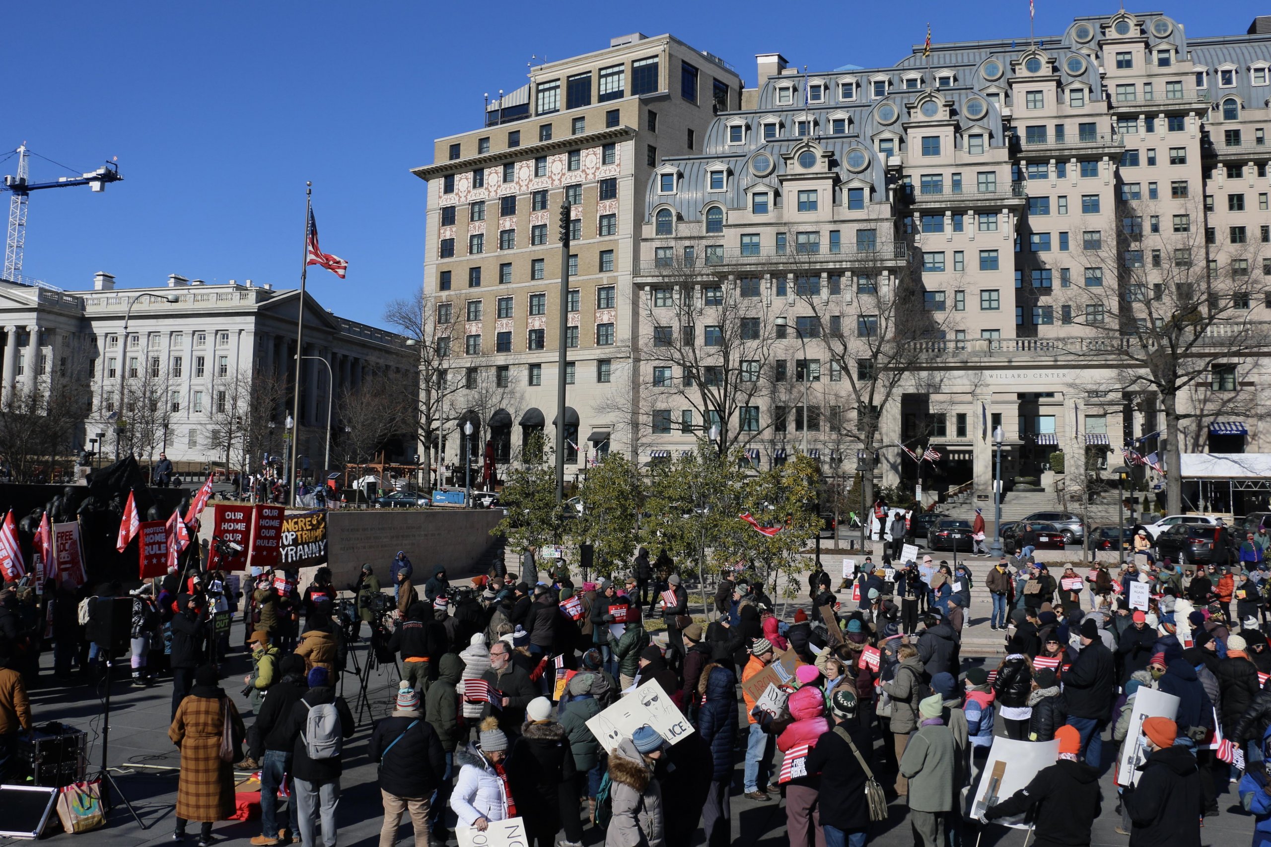 WASHINGTON — Protesters in Washington joined a nationwide walkout on Jan. 20, marking one year since President Donald Trump returned to office for a second term. Demonstrators gathered around Pershing Park after leaving work and school as part of a visible protest against the administration.