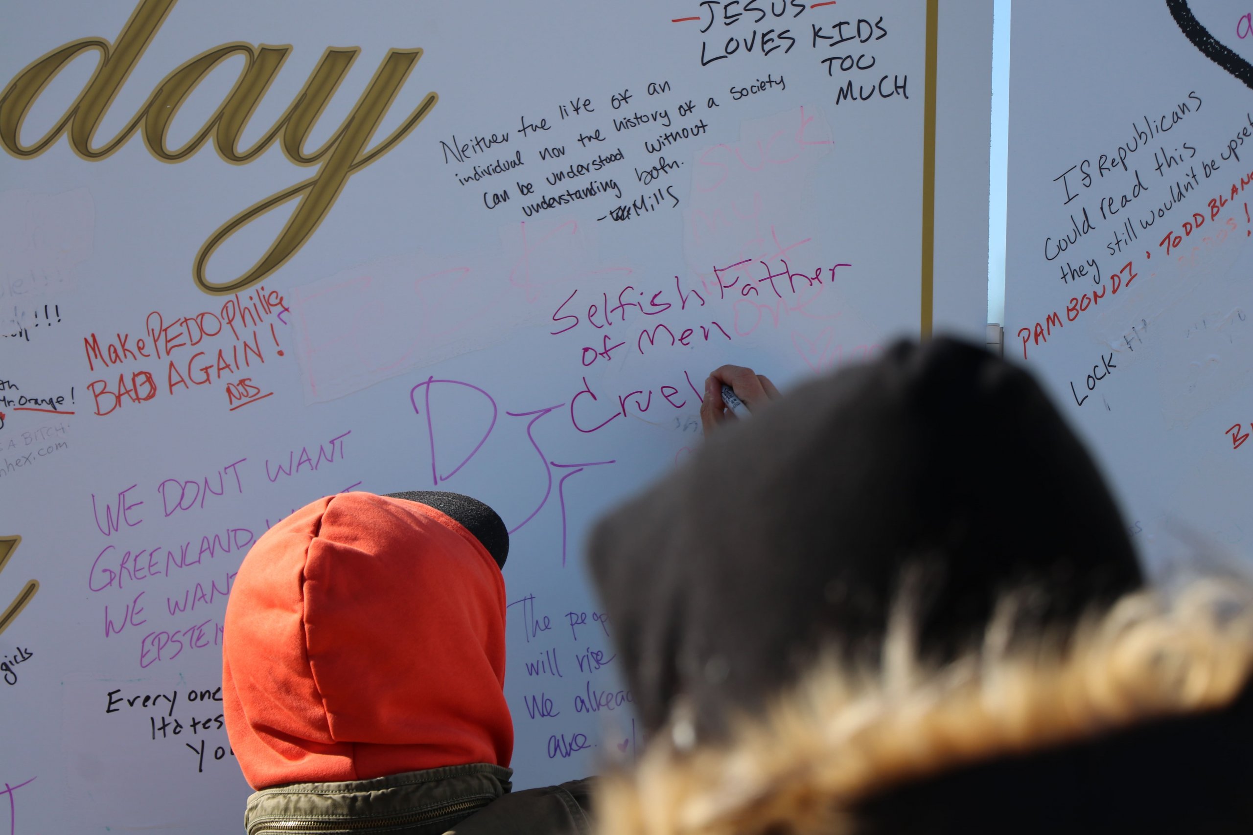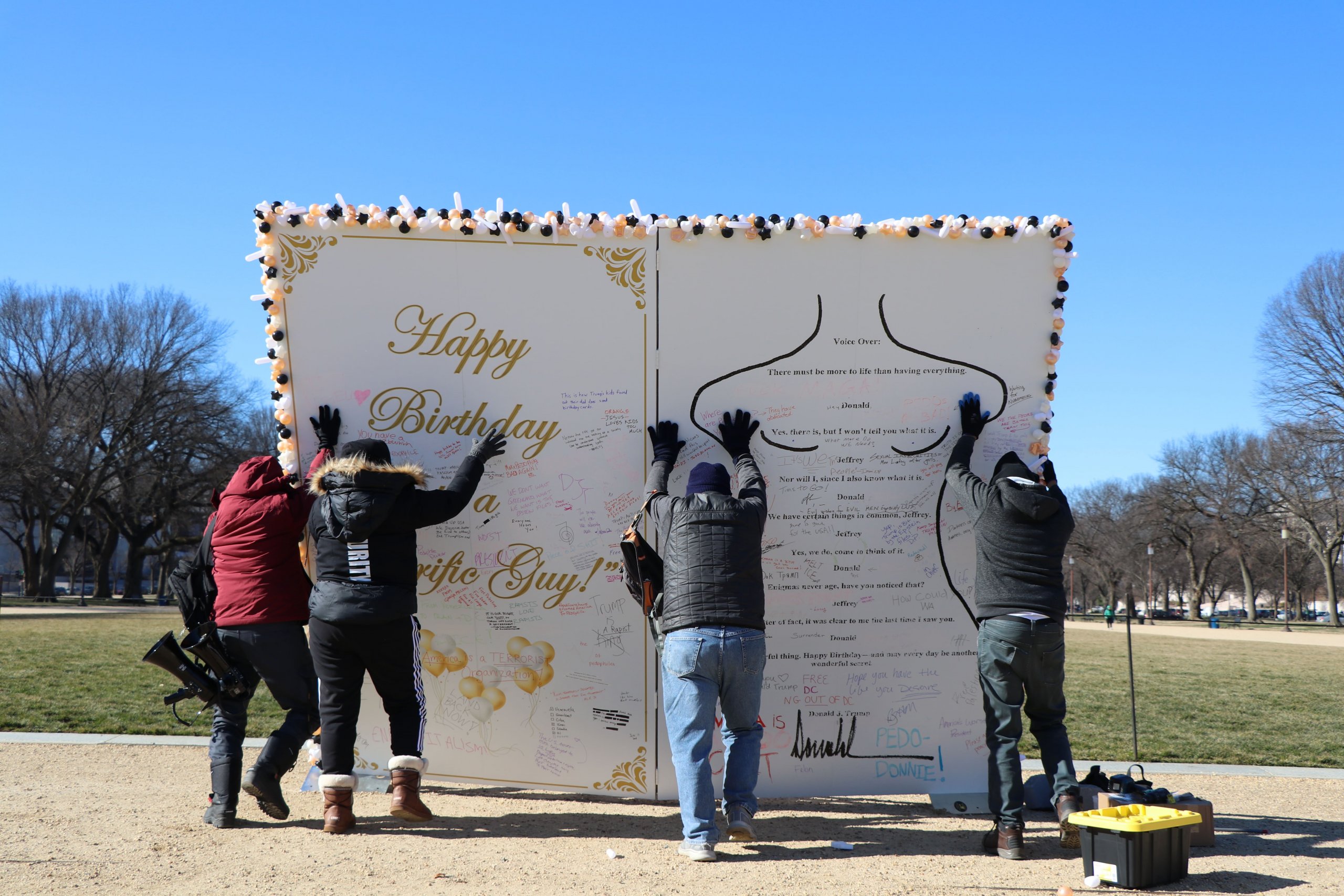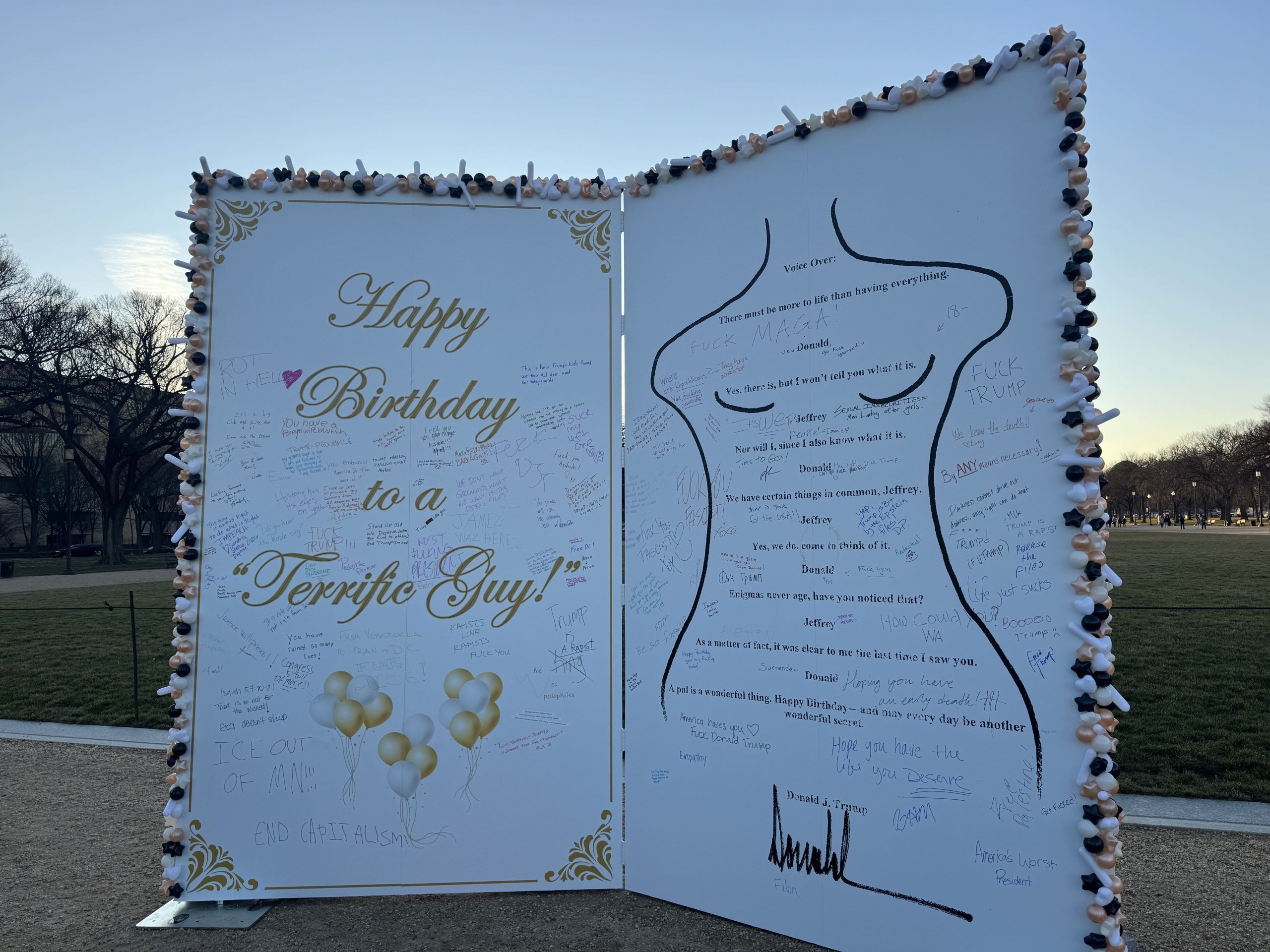Protest art gives people a safe way to exercise their First Amendment rights to free speech. In just one night, the card was covered in hundreds of messages from visitors condemning Trump’s presidency and his relationship with Epstein.